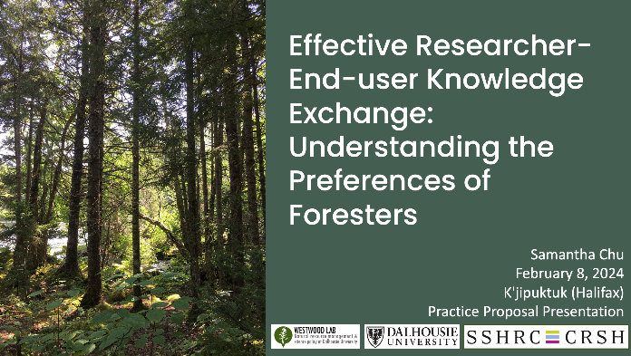 - Samantha was awarded 1st place for her poster on her research, titled Effective Researcher-End-user Knowledge Exchange: Understanding the Preferences of Foresters, at the Poster Symposium at the CIF-IFC National Conference and AGM